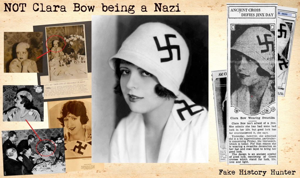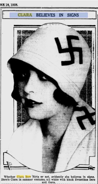 This picture shows famous actress Clara Bow in an outfit decorated with swastikas.