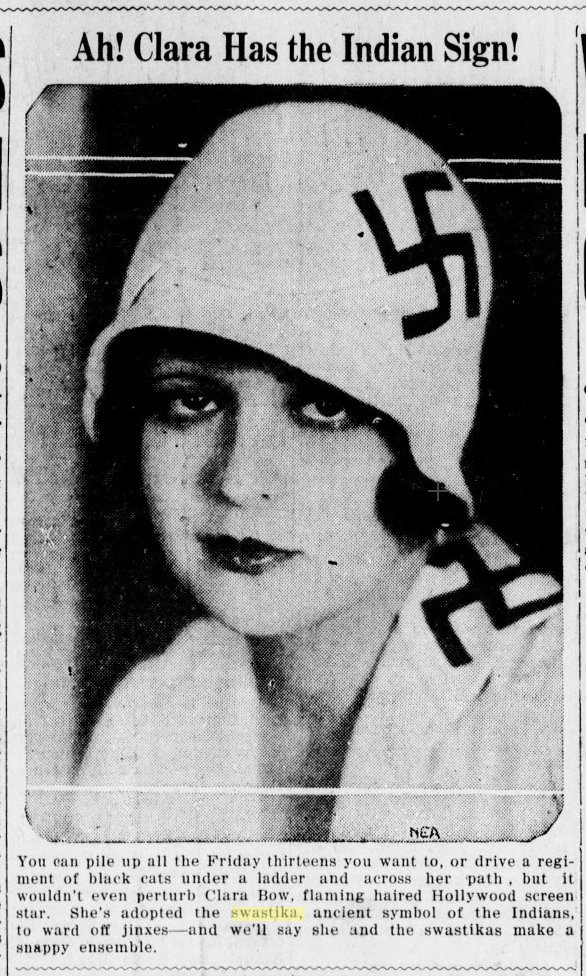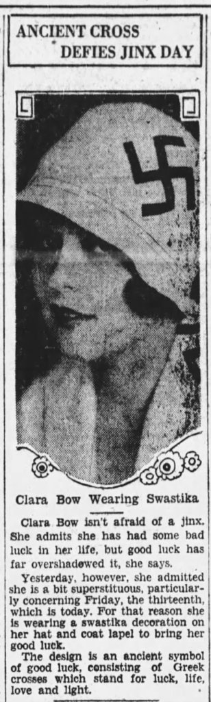 3. Article très documenté, parfaitement explicatif. Oui, les Américains considéraient cette croix comme porte-chance. Clara Bow était admirée d’Hitler mais ce ne fut pas réciproque. Il était le chef d’état et elle ne pouvait éviter de le rencontrer. Précisons que jusqu’en janvier 1933, la svastika n’avait pas de sens négatif aux States. Ils ne réagirent vraiment qu’en 1941, quand Hitler persuada le Japon d’entrer en guerre à ses côtés. Il avait déjà fait de même en 1940 quand il persuada déjà Benito Mussolini d’attaquer la France. Cette sinistre baudruche n’attaqua pas l’armée française (déjà désarmée par le Maréchal Pétain lorsqu’il fut élu). Ils mitraillèrent de malheureux civils durant l’Exode, fuyant sur les routes menant à la Zone Libre ! Quel choc lorsque nous l’avons subi.
