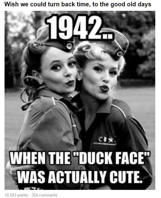 This picture has been going around the internet as a WW2 era photo showing two women posing with what is called a “duckface” these days.