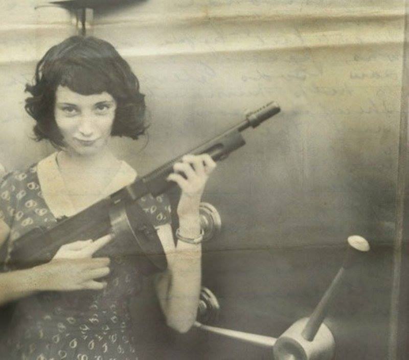 People have pointed out that that particular version of that type of machine gun wasn’t really available till the late 1930s, that the safe behind the woman is a modern gun safe and not the type you’d find in a bank, and of course, who would take some time to pose for a photo in the middle of a robbery?