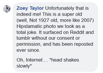 According to the response the photo was made around 2007 as a joke, surfaced on Reddit and Tumbler without her permission and has been reposted ever since.