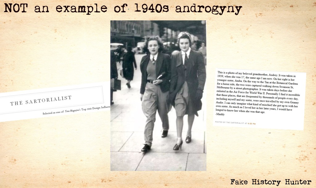Seeing a girl dress in what modern people think is unusual for the era makes them project their modern world views onto the image, after all there must be a reason for this 1940s girl to dress in that weird manner.