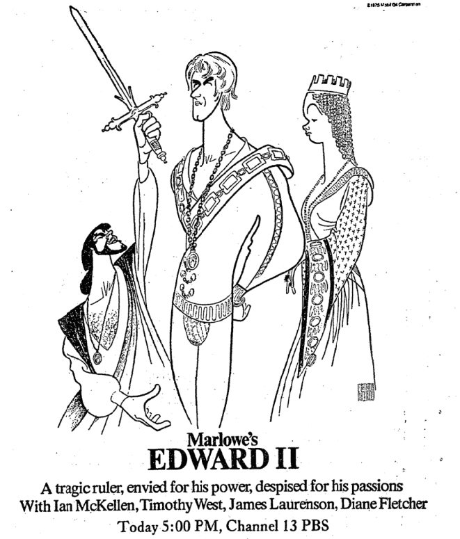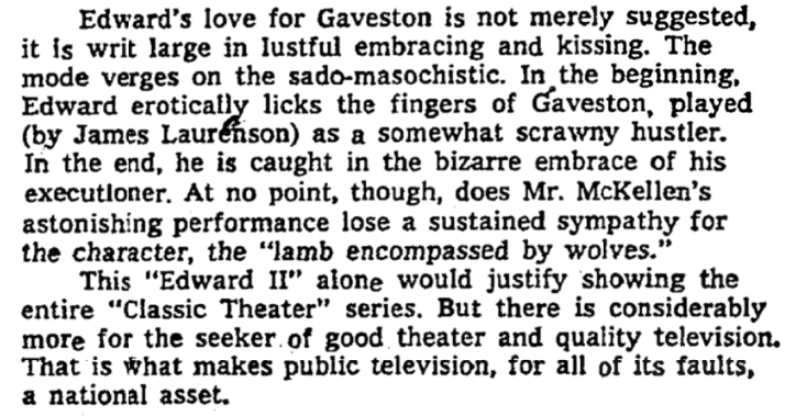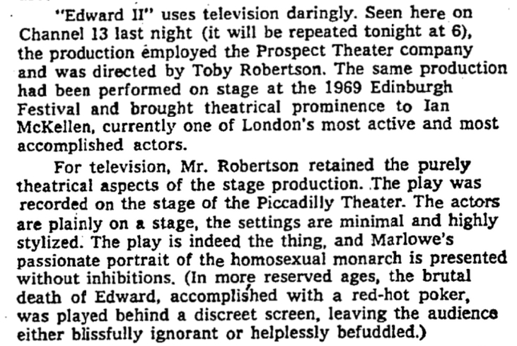 On August 6th 1970 at 21.10 the BBC broadcast Christopher Marlowe‘s play ‘Edward II‘, in this adaption Sir Ian McKellen passionately kissed James Laurenson, only 3 years after homosexuality had been (partially) decriminalised in the UK.