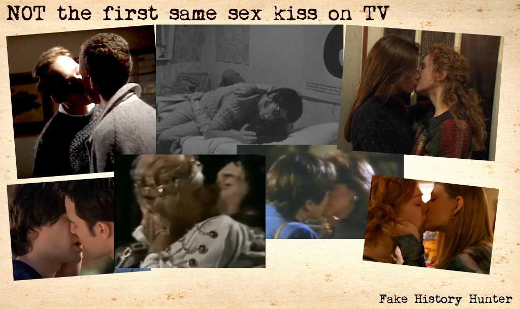 Others claim TV’s first gay kiss between two men was on an episode of the British soap ‘Eastenders’ broadcast in 1989 and the first lesbian kiss was on TV in 1994 on the British soap ‘Brookside’.