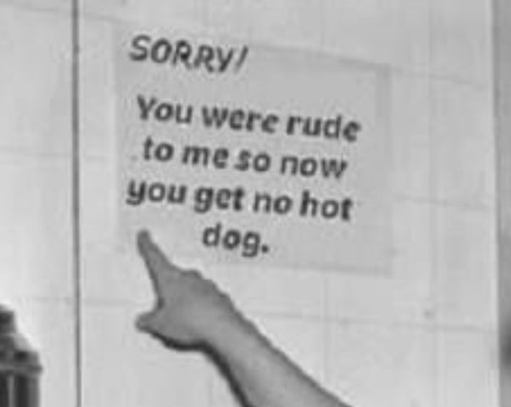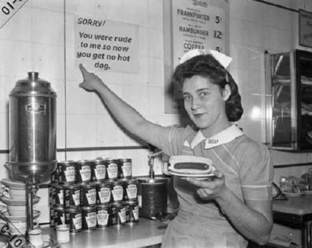 This image has been shared online with the claim it shows a waitress who refuses to serve a hot dot because someone has been rude.