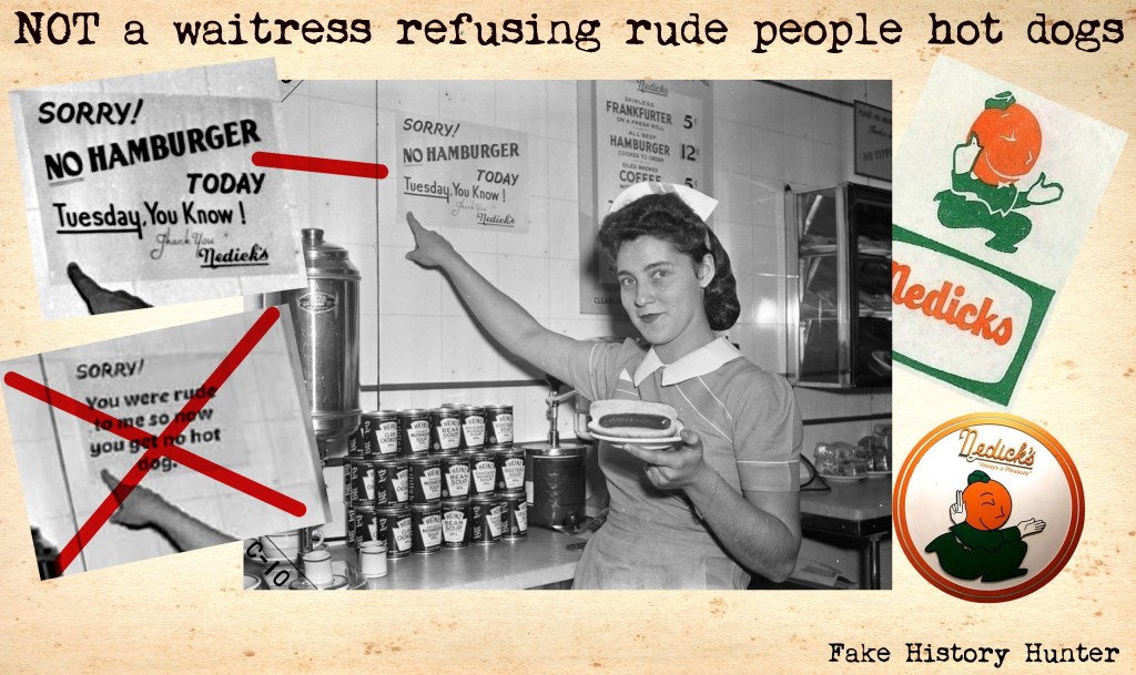 Perhaps that is the meaning behind the photo, maybe the waitress is making a joke about either the Meatless Tuesday initiative or the meat content of hog dogs.