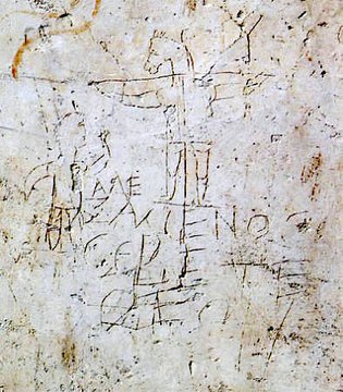 In greek it says; “Alexamenos worships God” and shows a crucified man with a donkey’s head.