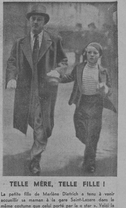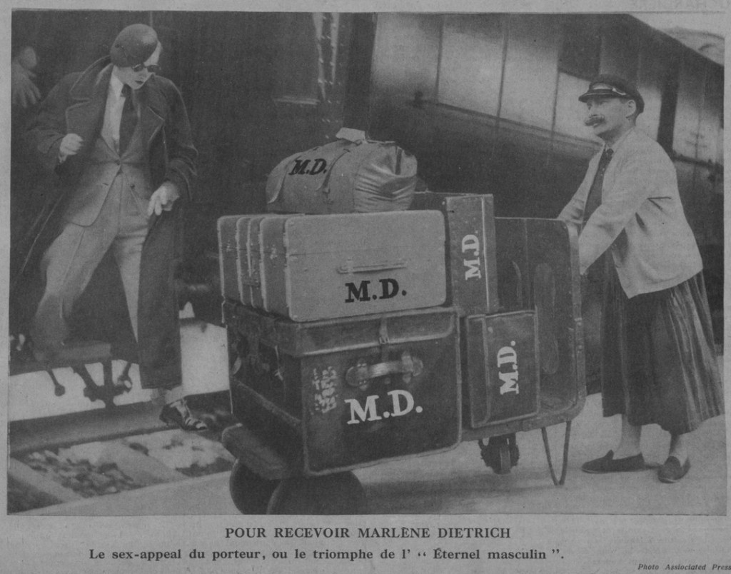 The French press did comment extensively on her “masculine” outfit: trousers, tie, chocolate-coloured polo coat, white shirt, sunglasses, and beret. Her daugther was also dressed like her (minus the tie) (here !). Some comments were supportive buy many were mocking her gender-bending appearance and there were cartoons such as this one (a man ogles an “effeminate” person and says “hey, that could be Marlene Dietrich“). And then there is this odd picture where she is greeted by a skirt-wearing porter. Still, she was an immense star and the French press fawned over her, trousers notwithstanding.
