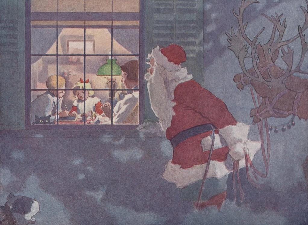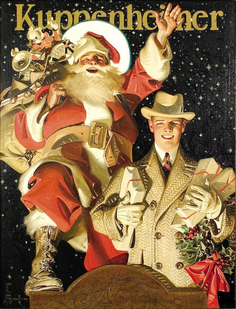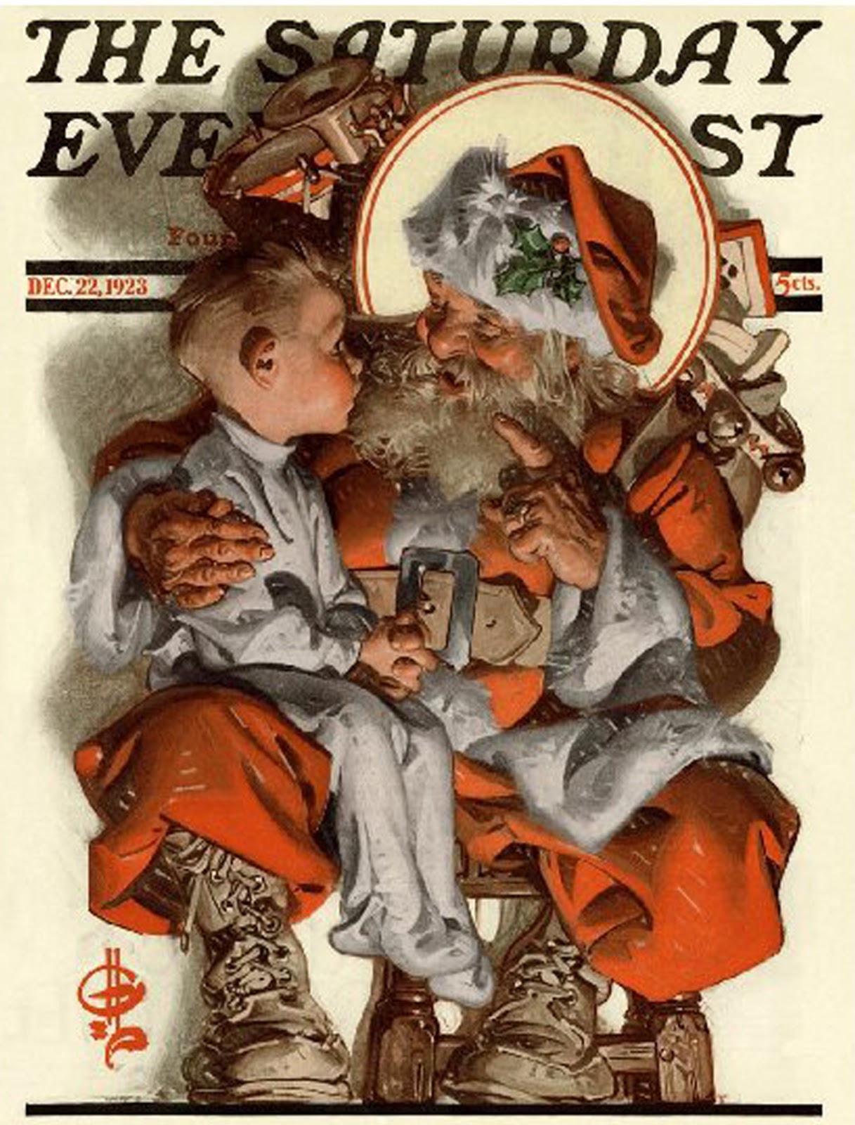 Especially thanks to illustrators like Norman Rockwell and Joseph Christian Leyendecker, a big round Santa in the red suit with fur trimming, the big white beard, the black boots, the belt, etc. had been a familiar sight across the United States and later the world, before Coca-Cola got their hands on him.
