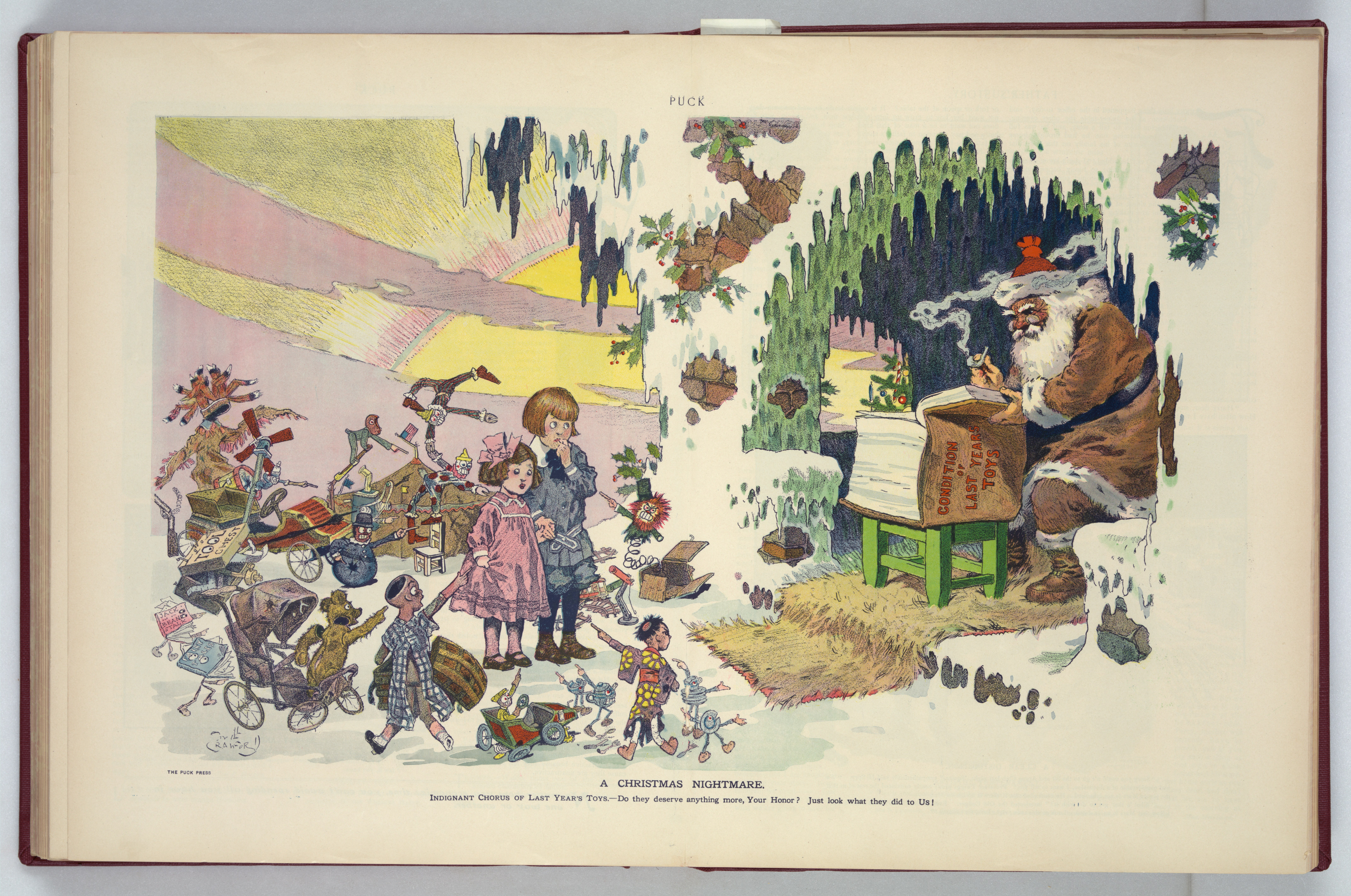 The drawing was titled ‘Santa Claus and His Works‘ and depicts Santa already looking very familiar and with pretty much all the familiar ingredients of the story; the reindeer, workshop, a book with children who were naughty or nice, it’s pretty much all there.