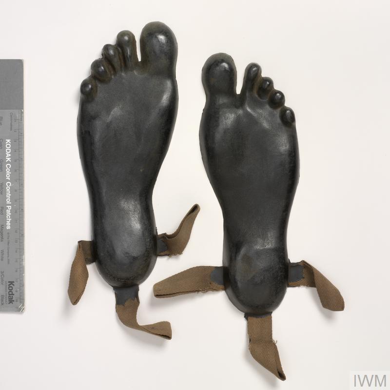 These were rubber bare foot casts that you tied under your regular shoes so that a when for instance you were landed on a beach somewhere, any passing guard who might see your footprint would just assume it was a regular bather or maybe a native in stead of someone wearing a suit and shoes.