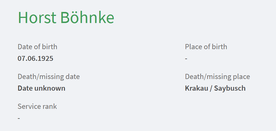 A Horst Böhnke is listed in the German war dead database as having been born on June 7, 1925, and missing on July 1, 1944 near Krakau (now Kraków, Poland.)