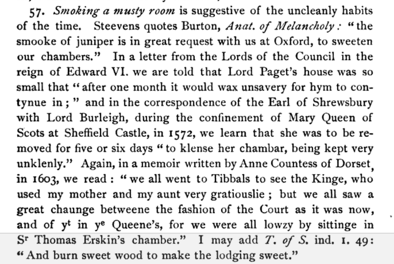 That’s not to discount the notion that it may have been referring to some type of irritation with the room. W.J. Rolfe, in an annotated 1905 ‘Much Ado About Nothing,’ references Clifford’s quote in referring to rooms that were musty and needed to be aired out and scented.