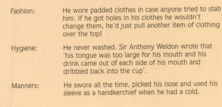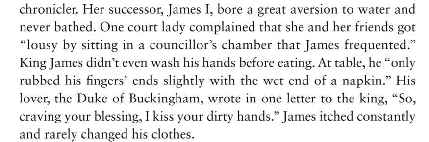 The book repeats long disproven myths about Elizabeth I (more about that here) and Isabella of Spain rarely bathing and then claims that James: never bathed, never washed his hands, spread lice in rooms he frequented, itched constantly, rarely changed clothes.