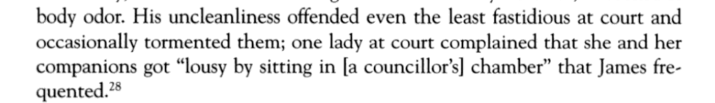 The books I’ve already referenced are not the only ones to suggest it might have had to do with uncleanliness, but again, let’s assume it’s literal and true, this would be have to do more with a lack of care in court for removing pests–not James I specifically not bathing.