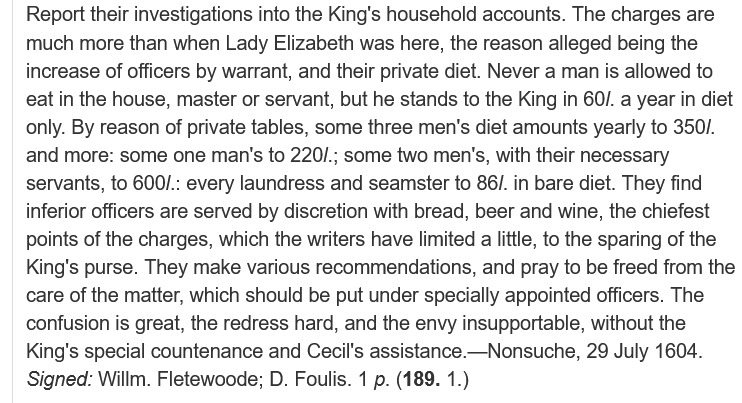 Specifically in the context of the “lousy” quote, Clifford was writing about the new king’s first stay at Theobalds House that occurred early on in his his reign. The stay was 4 days long, involved entertainments, meals, and lots of knighting.