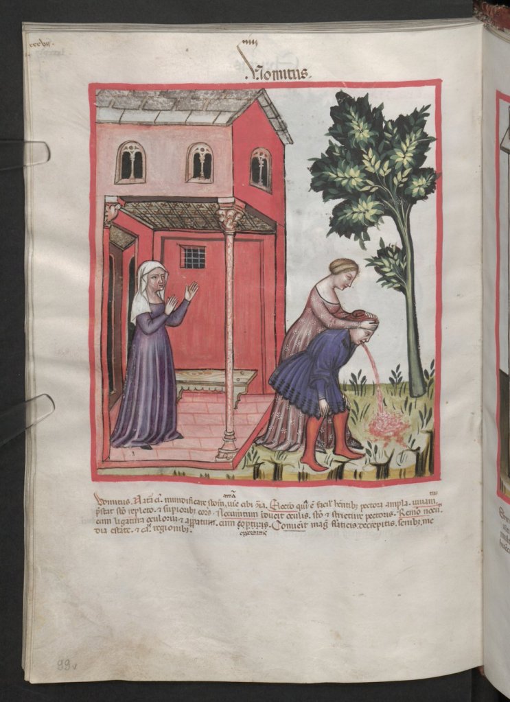 Oh by the way, just in case you’re wondering, here’s the original source for the picture used: Cod. Ser. n. 2644, fol. 99v: Tacuinum sanitatis: Vomitus .