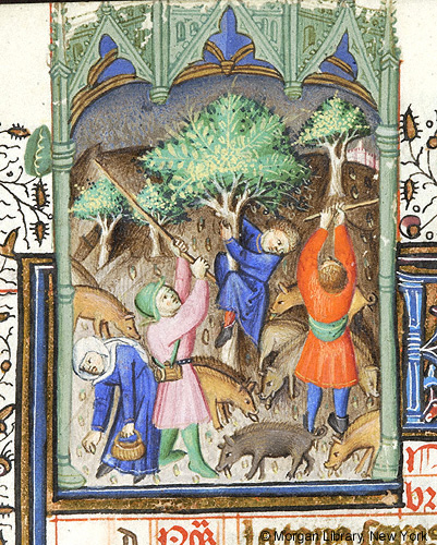 They especially liked acorns and there are many pictures that show us swineherds hiting trees with their sticks to get acorns to fall to the ground for the pigs to eat but they were also collected for feeding them with later