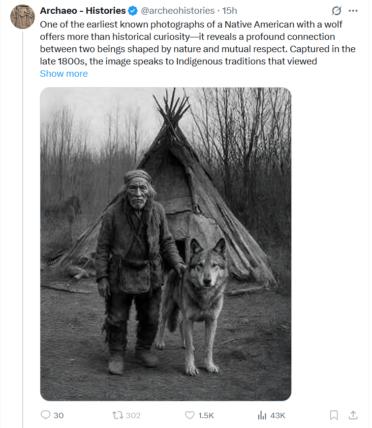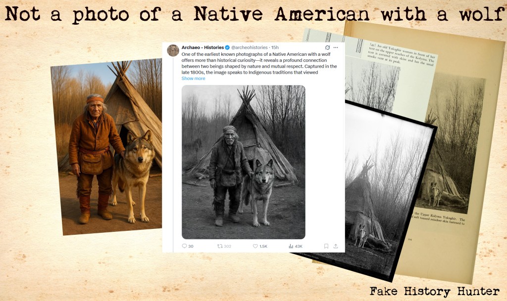 This picture has been going around the internet with the claim that it shows “One of the earliest known photographs of a Native American with a wolf” or “One of the few documented images capturing the coexistence of a Native American and a wolf”, usually followed by a nice story about how Native Americans and wolfs respected each others boundaries, lived in harmony and so on.