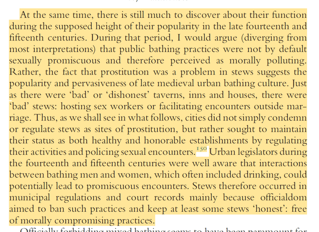Medieval people calling both bathhouses and brothels (with bathing services) stews doesn’t help and of course the naughty medieval art showing people having all sorts of cheeky fun in bathhouses doesn’t help either, although many of these depictions actually show what Medieval illustrators thought Roman bathhouses were like!
