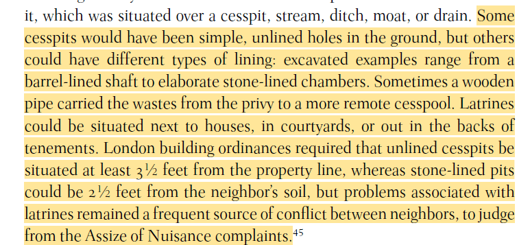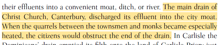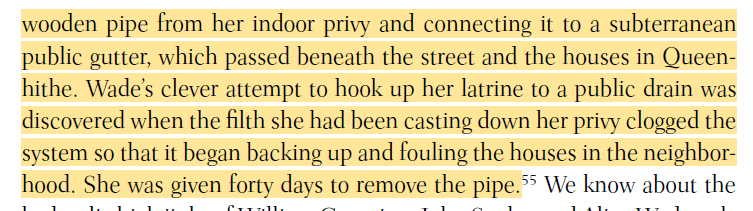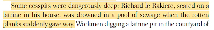 A medieval woman who had an indoor toilet that was connected to a “subterranean public gutter” (I’m always a bit confused when authors seem to avoid calling sewers sewers), I mean she deserves applause as well as a warning.