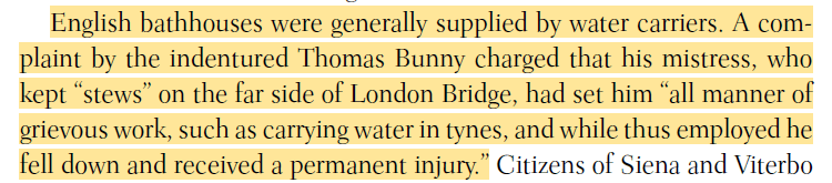 I’d love to know the source for the claim that English bathhouses had to be supplied by water carriers as that seems odd and unusual, many bathhouses were built in places where they could rely on easily getting water, they needed so much every day that carrying it from well to work seems like a strange choice.