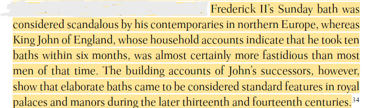I’ve looked for contemporary sources where people were scandalised by his regular bathing and found none, I think the author here confuses the rumours spread as propaganda by Frederick’s enemies about his lavish lifestyle and perhaps assumes that this must have had something to do with his bathing.