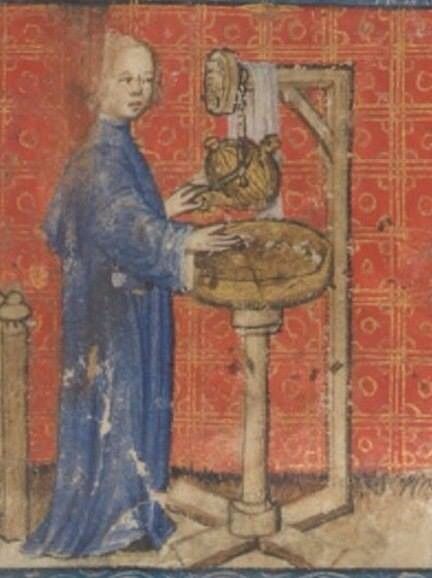 Although of course not all lavers were nice fixed stone washbasins, the hanging laver was very common and we see it in art all the time: