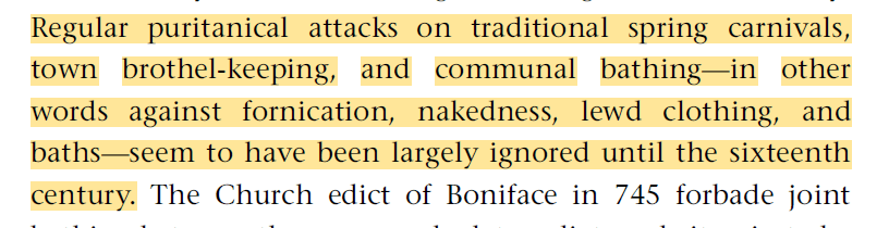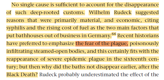 I find the idea that even though the plague returned every decade or so people in the 1500s suddenly decided that avoiding bathhouses was the thing to do.