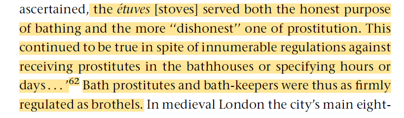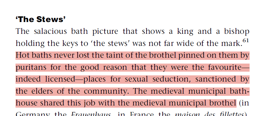 This book was published in 2008, before several groundbreaking books were published on medieval hygiene that dealt with a few myths & misconceptions, the following claims come close to how I thought about bathhouses before those new books came out: