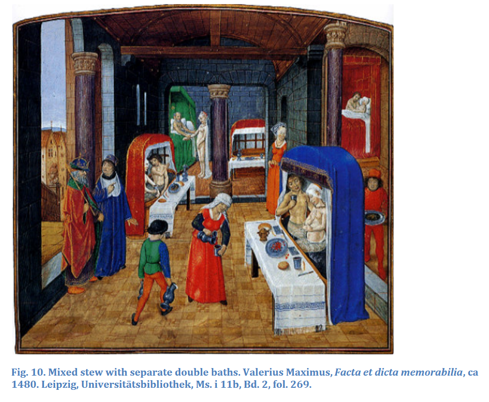 15th century Baden in Switzerland had two public baths and twenty-eight (!) private baths,here’s a description of a visit to one of those in 1416;