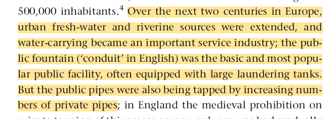 This bit is about post-Medieval Europe, but actually also describes the middle ages in a way, water carrying, public fountains, conduits, public pipes being tapped was all happening long before this point in the book.