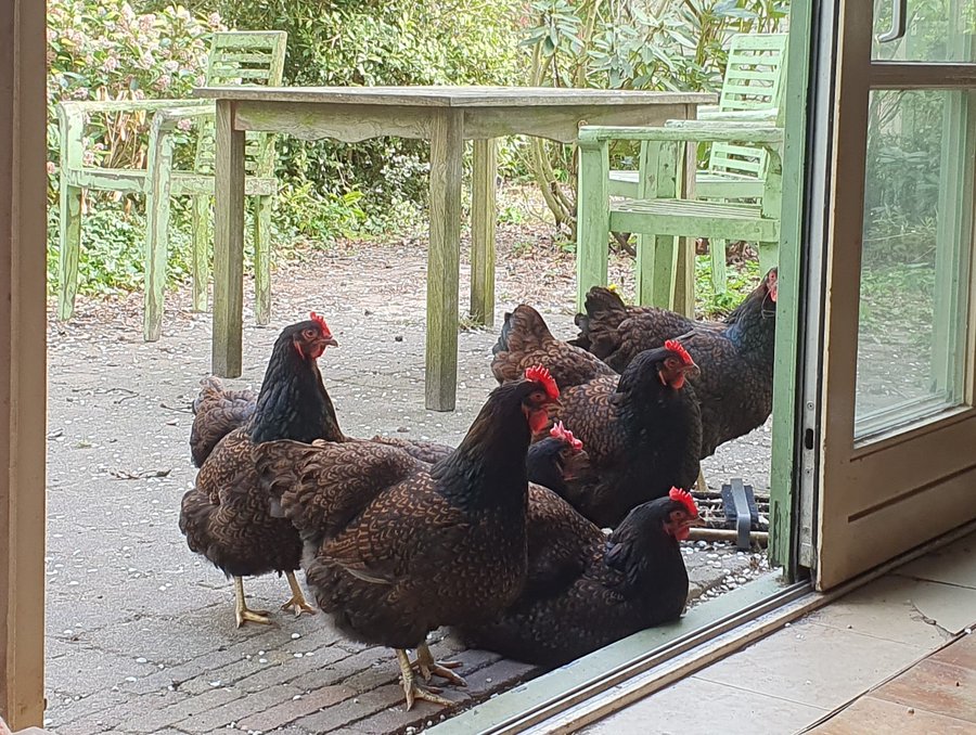 I live in the countryside, I leave my doors open when the weather allows it and the chickens love to visit, but I have trained my dog to bark and chase them out every time they do.