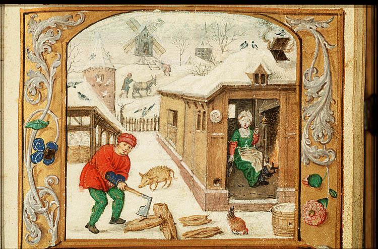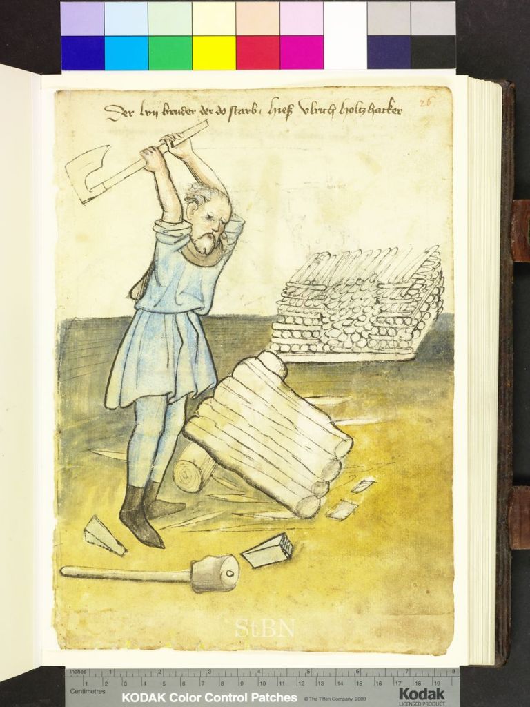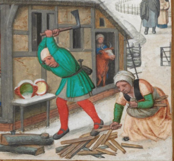 This is the most common depiction of medieval firewood chopping I find, the logs are resting on a horizontal log and then split, often with a wedge and a mallet, as you can see laying on the ground here;