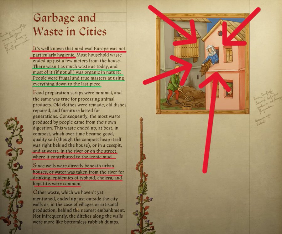 This I disagree with, Europe was no more or less hygienic than most of the world back then. The green underlined bits I agree with. No, they didn’t throw human waste out of windows into the gutters, there were laws against that. Cholera didn’t reach Europe till 19th century…
