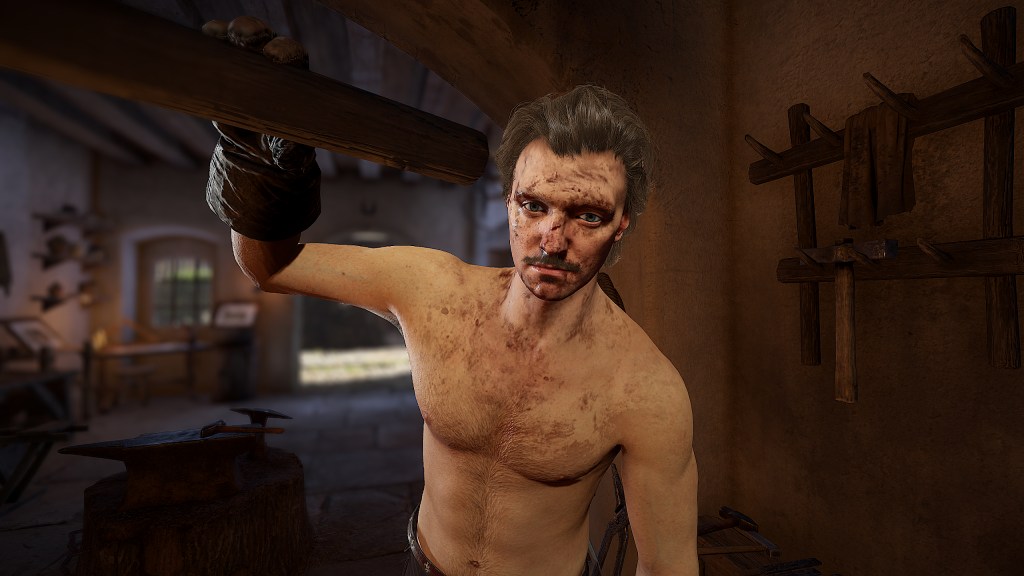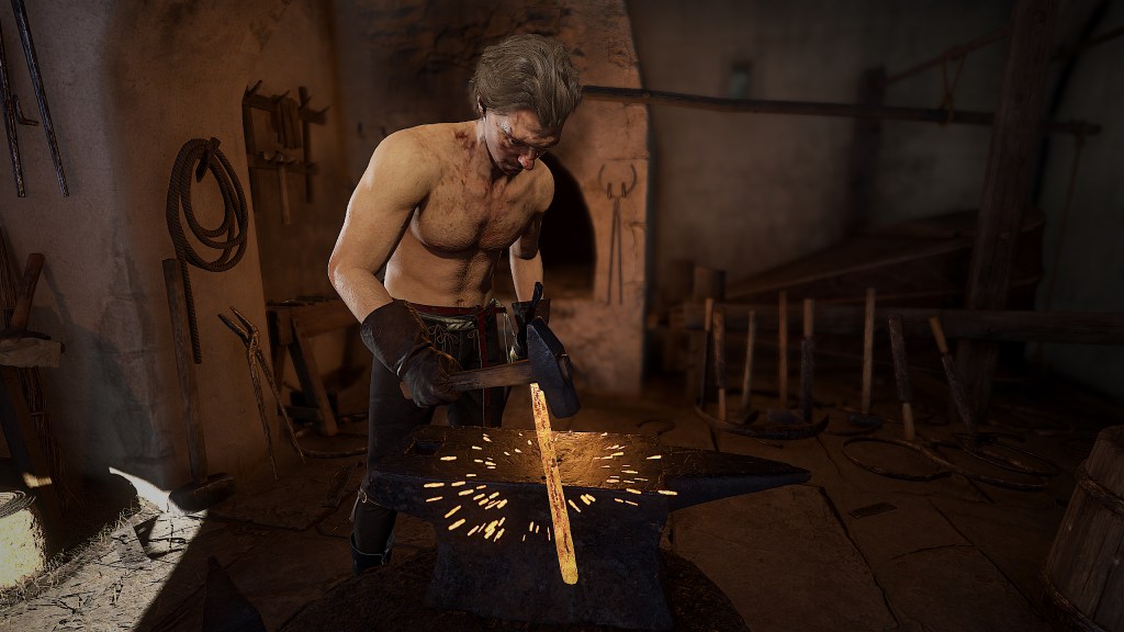 Anyway, as I said, you get to do a lot of forging and making stuff, and here’s where I spotted another inaccuracy, Henry kept doing it topless!