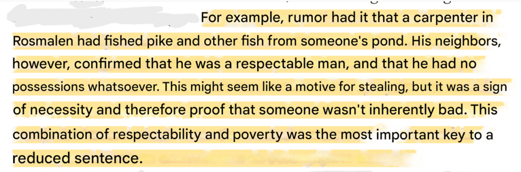 Besides learning about her situation, this story also shows us a side of early-modern justice you may not expect, lawmakers being compassionate and forgiving, caring about her circumstances and not giving her the punishment they could have: