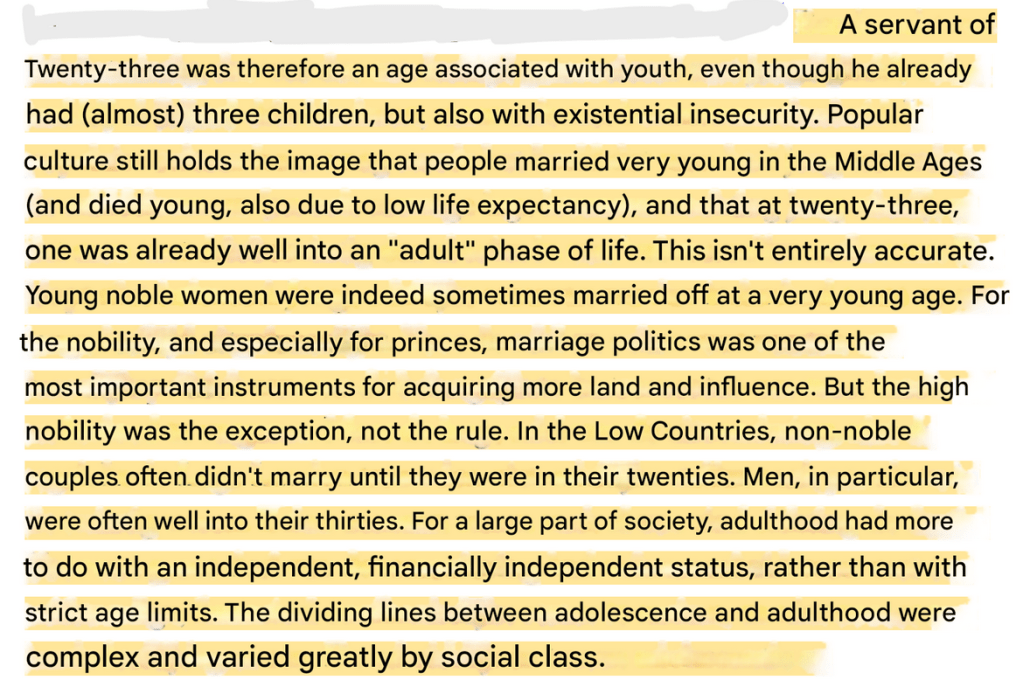 While writing about another case where someone was given leniency because the criminal was young, had 2 kids and a pregnant wife, Coomans takes the opportunity to deal with another stubborn myth about the middle ages, people getting married young: