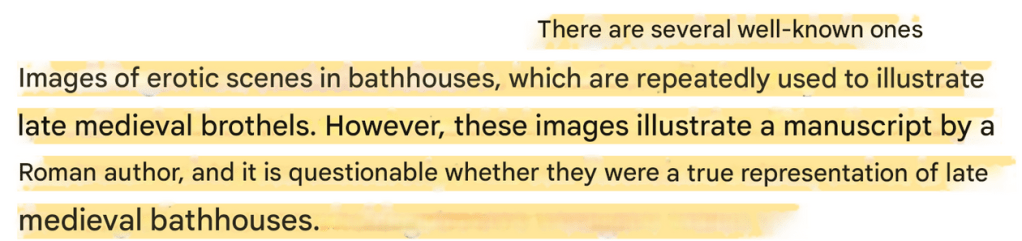 Many of the famous images of medieval bathhouses are actually meant to depict Roman or biblical stories, what we’re seeing is what a medieval illustrator thought happened in those ancient bathhouses.
