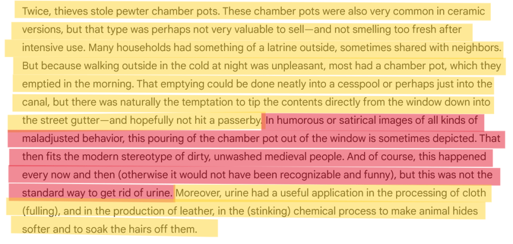 Here we learn that outhouses were very common, that people used a lot of chamber pots and that the whole idea of everyone just emptying those out of windows into streets is a trope, more Hollywood than History.
