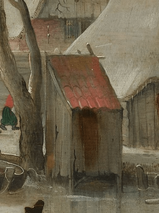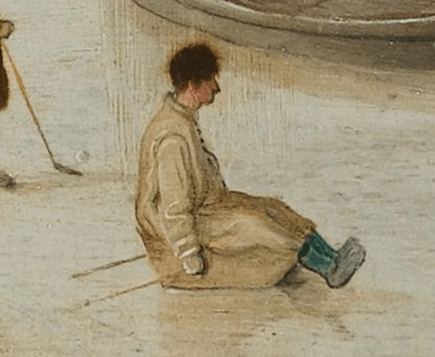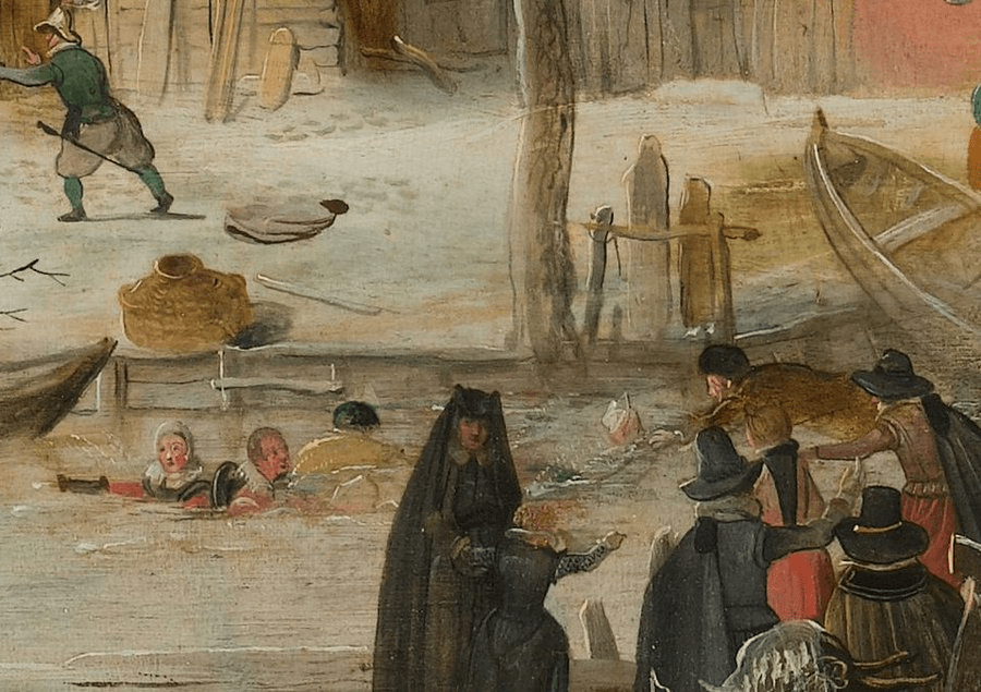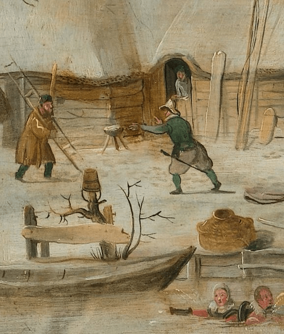 In these Dutch winter paintings someone is always falling and often someone going through the ice, but this is the first time we have a bunch of people ending up in this predicament: