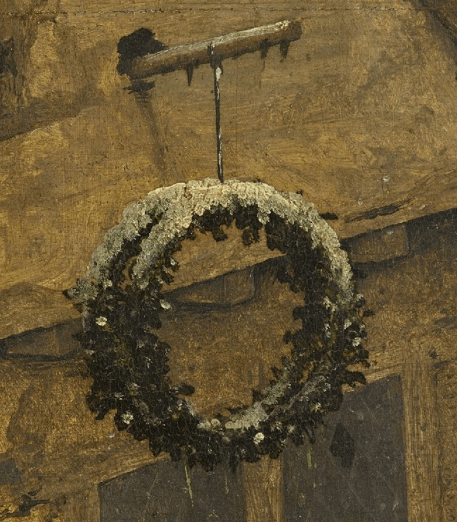 We know this is an Inn because of the wreath and the jug hanging outside the building. It sure looks cosy inside, I so wish we could go in. I think we see some improvised repairs in the window above the door, glass was expensive.