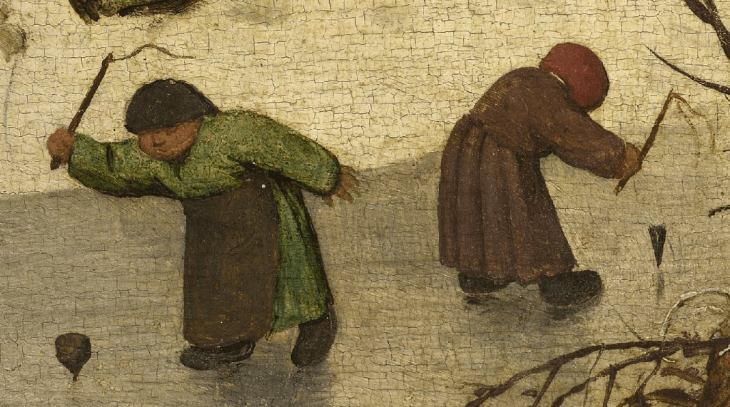 Two other kids are playing with spinning tops. What a great idea to do that on the ice, why did I never think of that when I was their age?