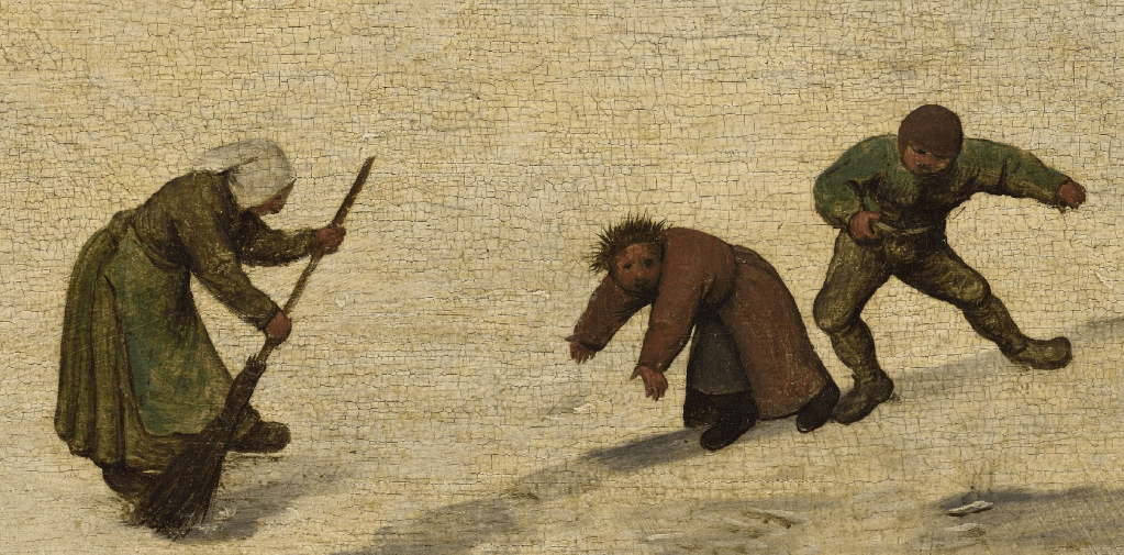 Looks like mum is sweeping the ice so the kids can slide on it. Another adorable scene.