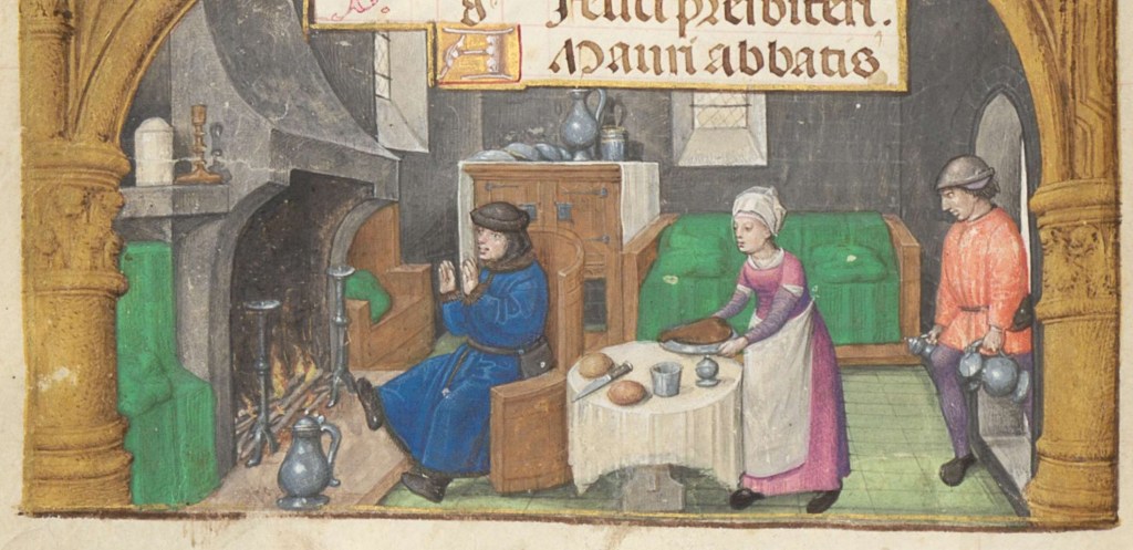 The book begins in winter, we see a well off household, the man is warming his feet by the fireplace, a jug is nearby, likely also warming up, possibly water for washing hands or maybe wine or some other drink.