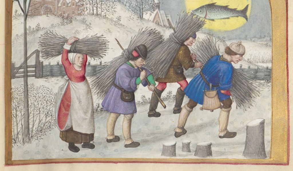 In this illustration we see the workers carrying firewood home, note the leg warmers and the particular way they carry the firewood by sticking a stick through it.