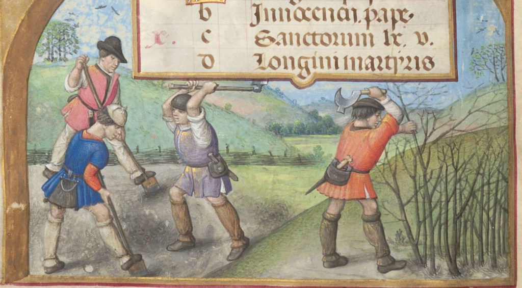 We do see evidence of chopped down trees, but there’s no real evidence of wood blocks being used or people chopping those wood blocks on a trunk, even though we see that in pretty much every film, tv show or even historical re-enactment set in the middle ages.