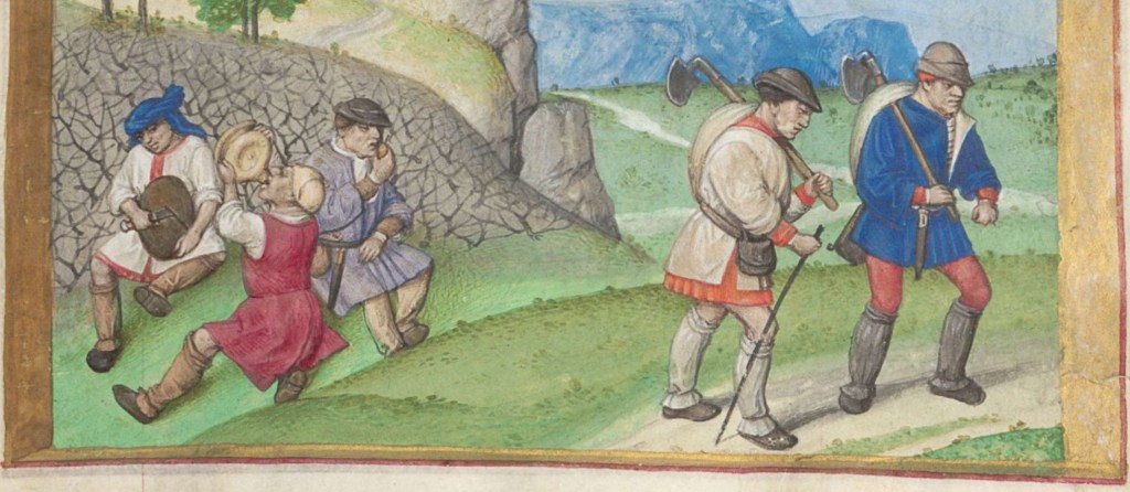 They wear brightly coloured clothing, quite nice pouches and knives on their belts and again legwarmers, this time without hose underneath: