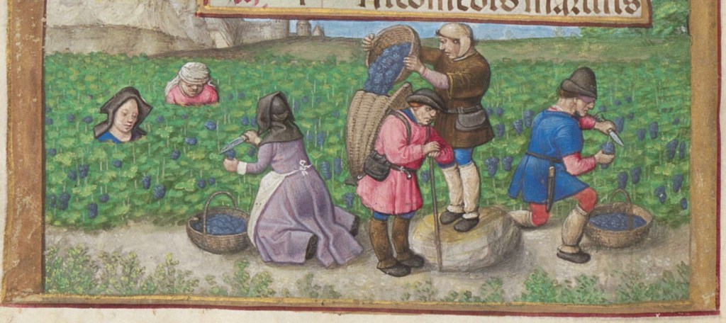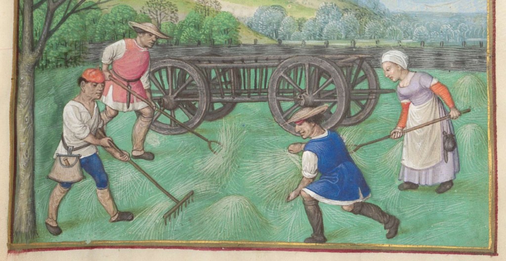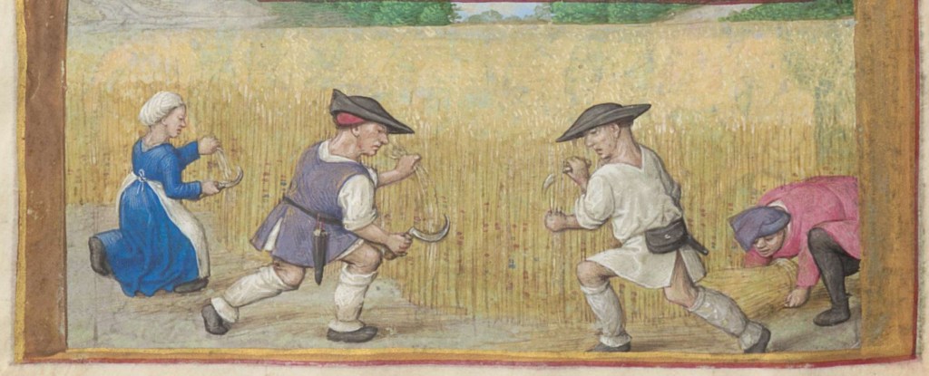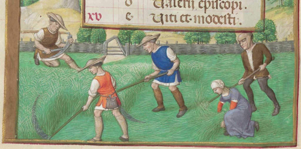The harvesting scenes are interesting. The top two are using scythes to cut hay. In the bottom one they are using sickles to cut the ears of wheat off the straw. You wouldn’t use a scythe for that as the wheat would end-up on the ground and not in your basket.