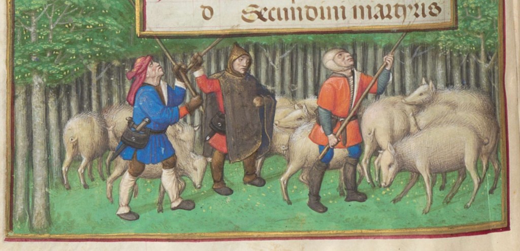 Herding pigs into the woods, here they can feed themselves on chestnuts, which the pig herders are bashing out of the trees.